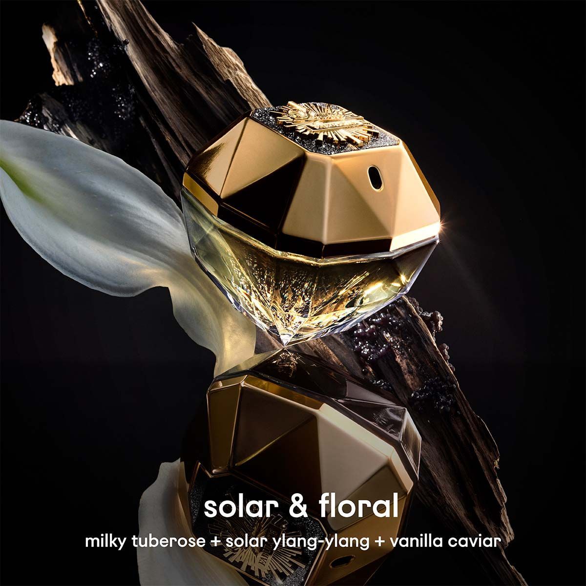 Introduced in 2021, this oriental floral fragrance with sparkling, sensual notes forms a captivating pair with the masculine Rabanne 1 Million Parfum, creating a harmonious symphony of scents. From the first spray, your senses are enchanted by the invigorating freshness of tangerine oil, heightened with a pinch of pink pepper, all set against the backdrop of a hot sand accord—an olfactory overture that sets the stage for the extravaganza to follow.
